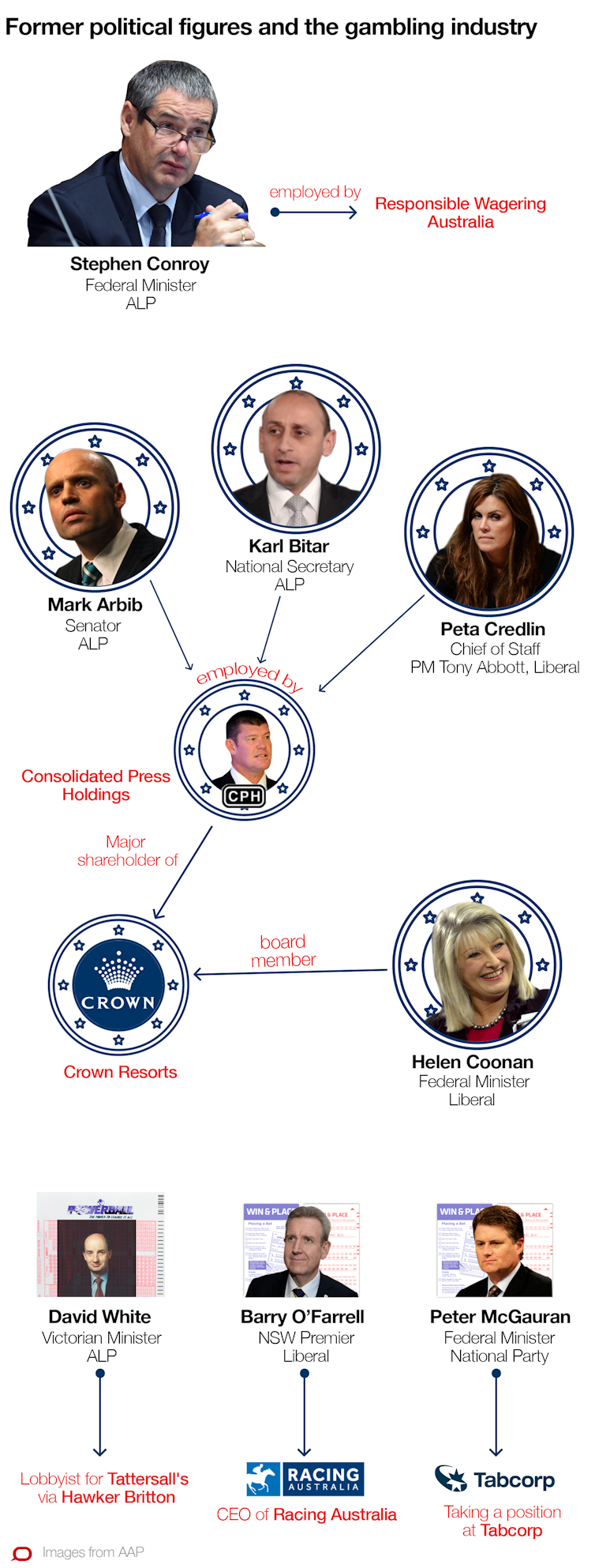Of the Liberals, Peta Credlin, former chief-of-staff to Tony Abbott, works for James Packer’s Consolidated Press Holdings, which owns a major share of gambling giant Crown. And one-time federal Liberal minister Helen Coonan continues to be a board member of Crown.