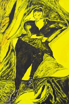 Of all the portraits of artists, the one that most stays in mind is Tom Polo’s I once thought I’d do for anything for you (Joan), a portrait of Joan Ross. It is painted in the fluorescent yellow that has long dominated her art, while the artist is dressed in her signature black. Despite limiting himself to two colours (or perhaps because of it), there is a visual extravagance about this work, as he successfully evokes Ross’s acute gaze, the way she deconstructs the world around her.