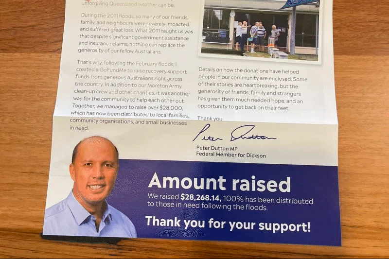 “What [the 2011 floods] taught us was that despite significant government assistance and insurance claims, nothing can replace the generosity of our fellow Australians,” Dutton said in the flyer. “That’s why, following the February floods, I created a GoFundMe to raise recovery support funds from generous Australians right across the country.”