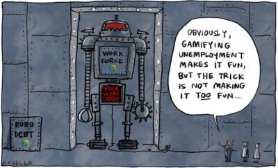 Robodebt would continue its cruel and virtually autonomous abuse for more than a year after the audience politely chuckled at Campbell’s joke.